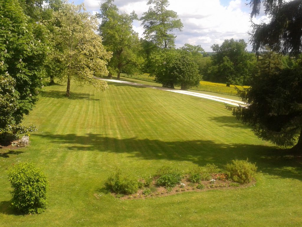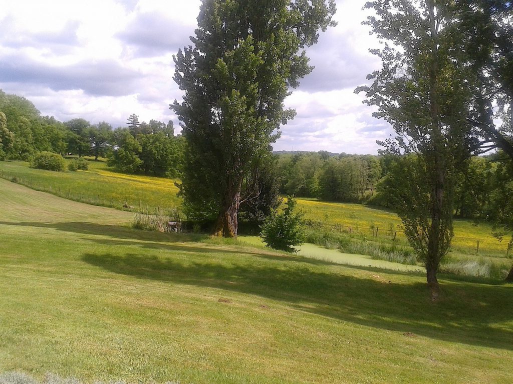Pièce d’eau. Beaux arbres centenaires. Environnement très calme, entouré par des champs ou paissent des chevaux (le corps de bâtiment à l’arrière héberge un couple d’éleveurs).